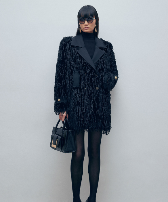 A two-tone curly faux-fur coat with a soft texture in warm creamy shades, featuring wide...