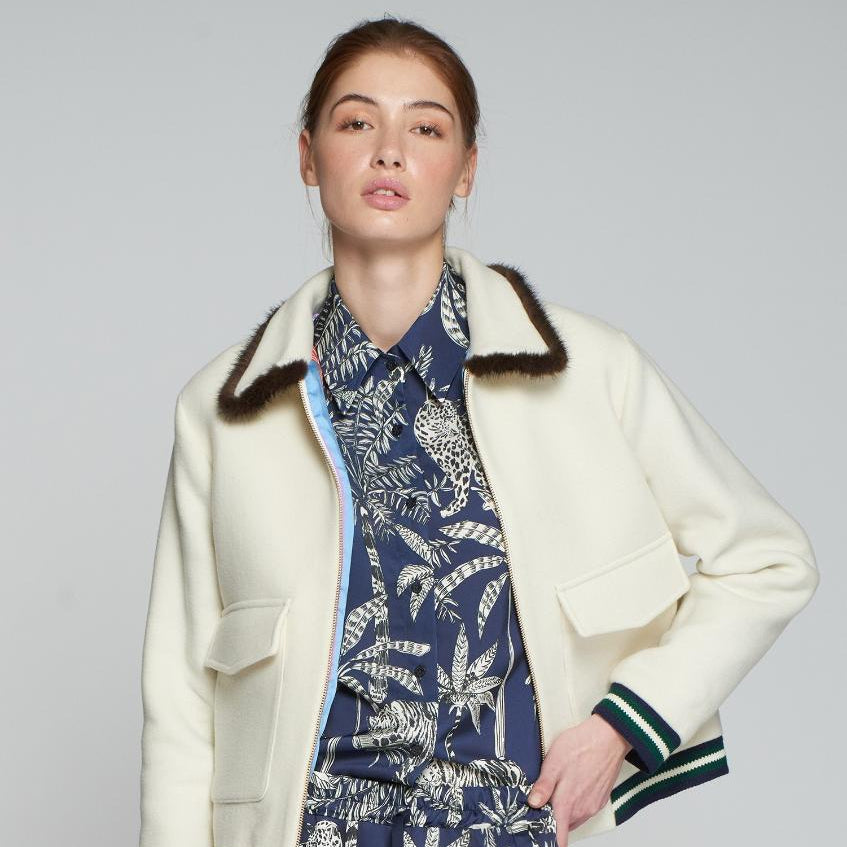White wool bomber jacket with real mink fur detail on the collar. Long sleeve. Front...