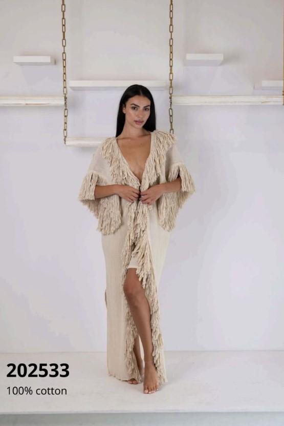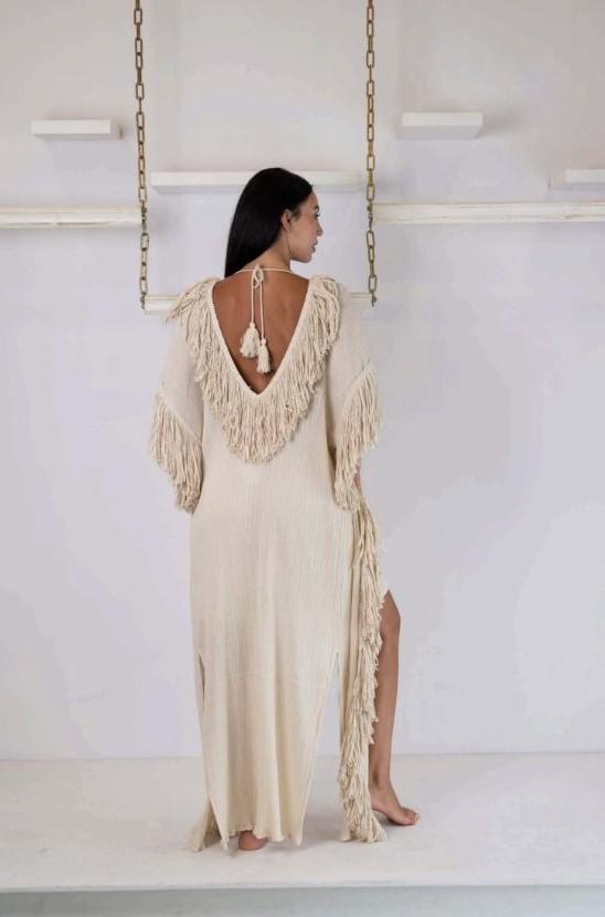 Step into elemental elegance with this 100% cotton fringed garment, designed for barefoot freedom and effortless grace